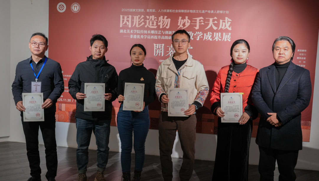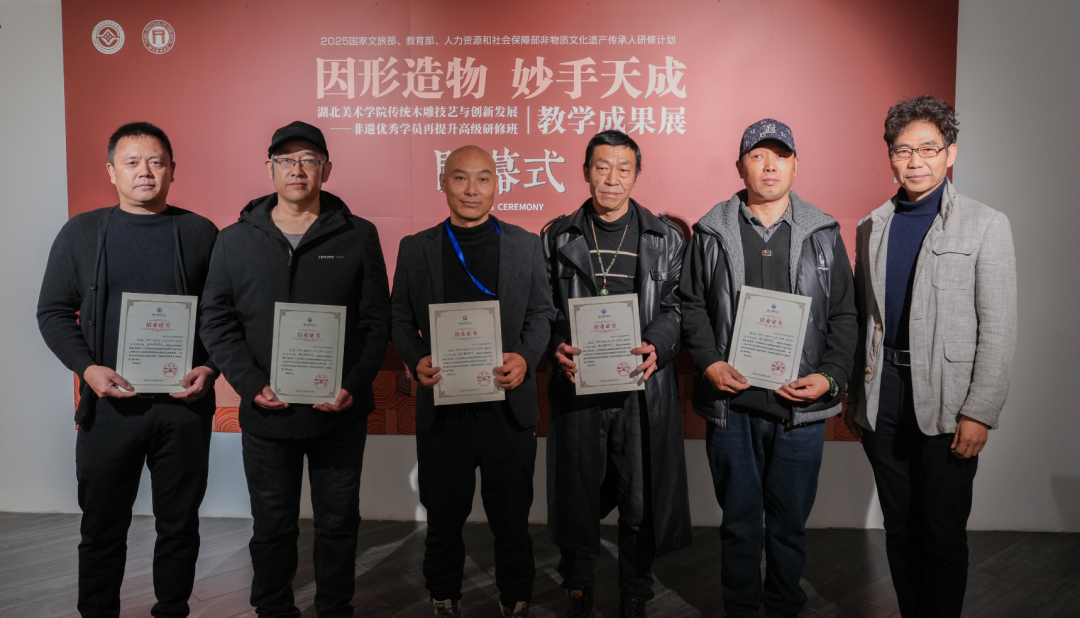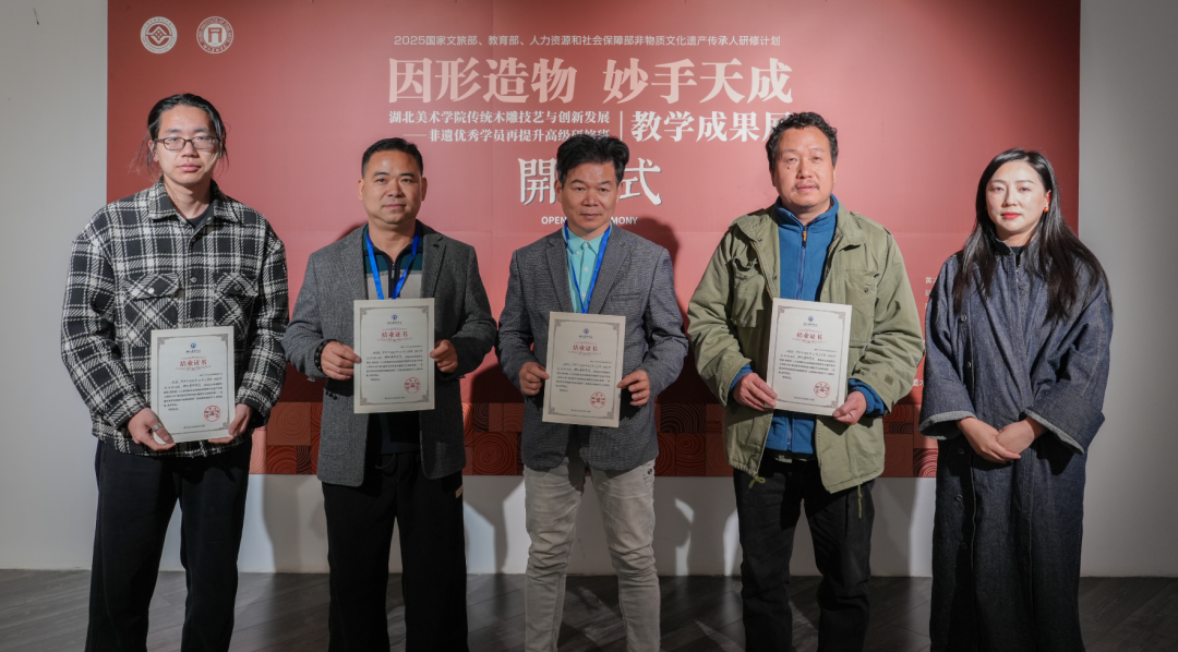 初冬的昙华林,艺术气息愈发醇厚。2025年11月,传统木雕技艺与创新发展高级研修班结业仪式暨教学成果展在湖北美术学院昙华林校区美术馆隆重举行。来自全国各地的学员、教师代表、非遗传承人及院校领导齐聚一堂,共同见证这一场传统技艺与当代思维碰撞交融的盛会。出席的校外嘉宾有:武汉木雕老艺人孙汉生、武汉城市学院教授(武汉木雕代表性传承人)张静、马来西亚理工大学博士郭珍;校内嘉宾有:湖北美术学院实验艺术学院组织员彭柱武、湖北美术学院继续教育与培训学院院长何明、湖北美术学院实验艺术学院党委书记李宁、湖北美术学院雕塑与公共艺术学院教师李冰、湖北美术学院继续教育与培训学院办公室主任李志敏和全体教职工、以及湖北美术学院研究生代表。