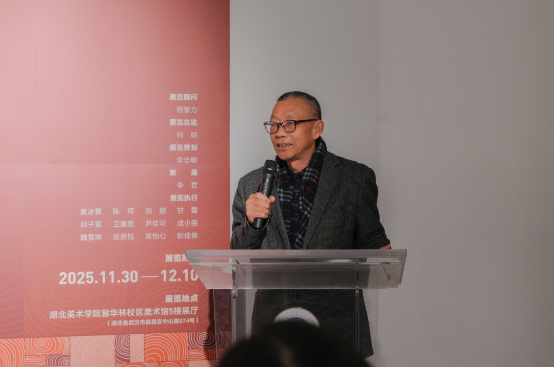 随后,湖北美术学院继续教育与培训学院院长何明登台,娓娓道来本次研修班的办学历程。他从“理论奠基、实践驱动、文化溯源、创新转化”四个维度,回顾了从课堂研修到东阳考察,再到楚文化主题创作的完整教学闭环,对学员们的钻研精神与创作热情给予了高度评价。