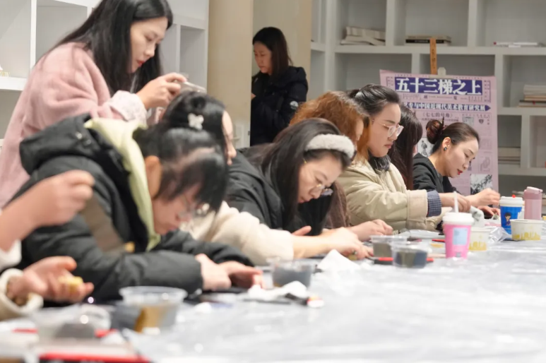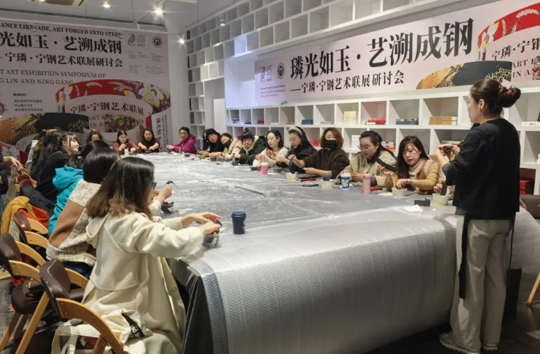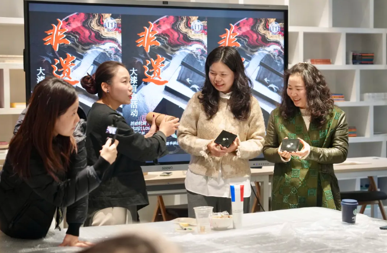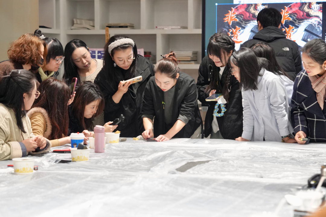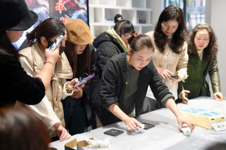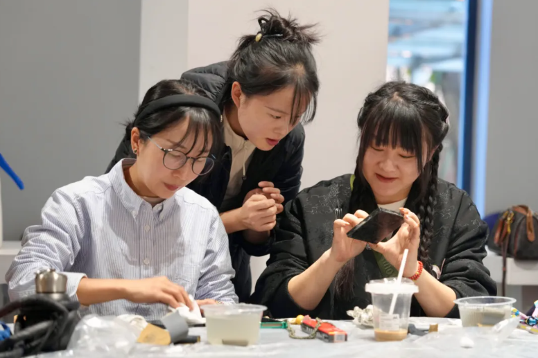 在随后的实践环节中,活动创新性地设置了“大漆盲盒”体验项目,引导参与者亲身感受大漆螺钿漆画技艺的奥秘。在蒲美合教授的细致示范与逐一指导下,学员们沉浸于动手创作的乐趣之中,在一刮一抹、一嵌一磨的实践里,深刻体会着传统非遗技艺的匠心独运与创造性转化的无限可能。